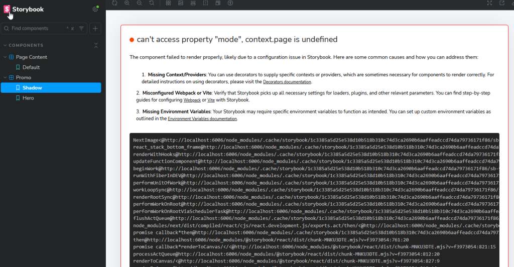 The can’t access property “mode”, context.page is undefined was a downright pain in the ass to diagnose. It turns out that Content SDK uses the page Context to determine whether or not to set the unoptimized attribute on NextImage. Pretty lame. We can fix it though: